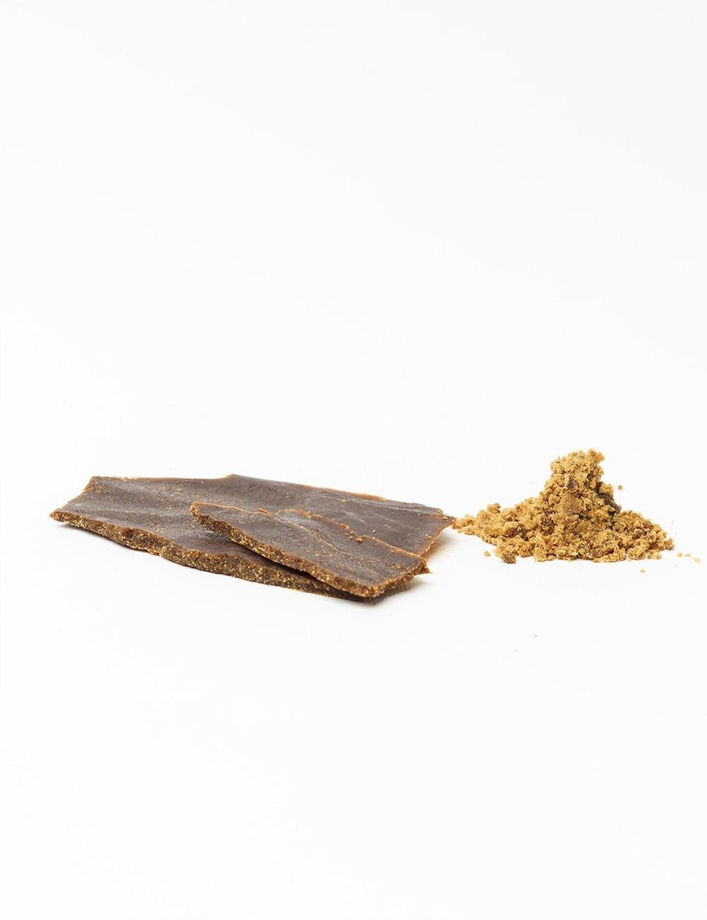 El 3x Filtrado CBD es una resina de la más alta calidad y pureza, seleccionada por su perfil aromático complejo y profundo, dominado por notas terrosas y amaderadas, con sutiles toques especiados y dulces que la convierten en una de las extracciones más sofisticadas y limpias. Destaca por su doble presentación: presenta finas láminas ámbar-marrones, translúcidas y de aspecto quebradizo (tipo ‘shatter’), junto a una pila de polvo fino, friable y de un tono marrón dorado que se desmorona sin esfuerzo, resaltando su meticuloso proceso de refinamiento.